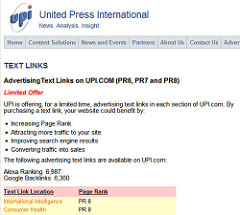 Threadwatch reports that the United Press International is selling links based on PageRank values. If you visit the advertising section, specifically for text links you will clearly see UPI marketing those text links to manipulate rankings and not for direct traffic building purposes like this:
