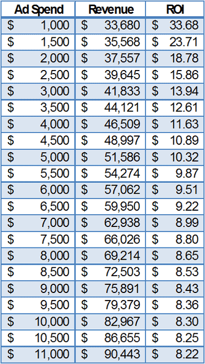 There are ways to evaluate the trade-off, and forecast results. Here is an example of an analysis that is possible to determine the optimal mix of revenue and ROI. The data reveals a very clear trade-off between incremental revenue and a lower ROI.